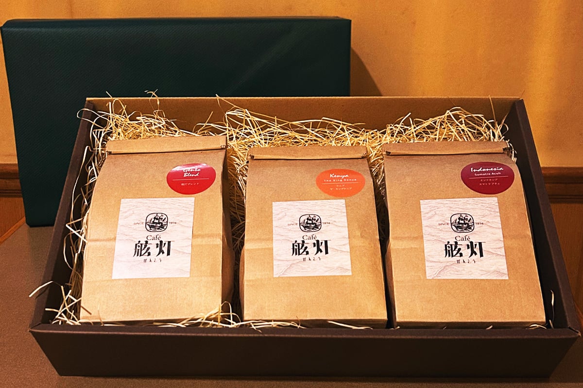 舷灯ブレンド100gと、焙煎士おすすめのシングル珈琲2種を各100gでセットに致しました。